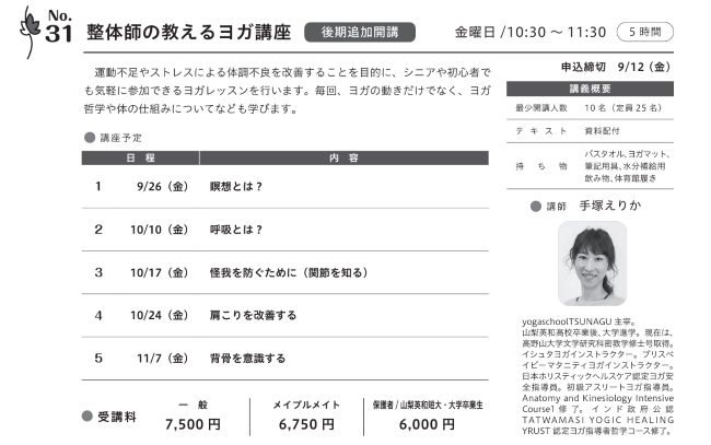 今回のメイプルカレッジ後期講座では、9月26日の「瞑想とは?」から始まり、11月7日の「背骨を意識する」まで、計5回の講座を通して、ヨガの多面的な魅力をお伝えするべくがんばります。